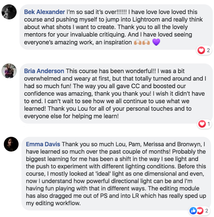 This course is set for all levels and all different strengths, whether it is in portraits, landscape, macro, food, or just your own family that you want to capture the best you can. I loved the support I received and the ladies doing the course were like angels and inspirational, who both encouraged and directed me when needed.