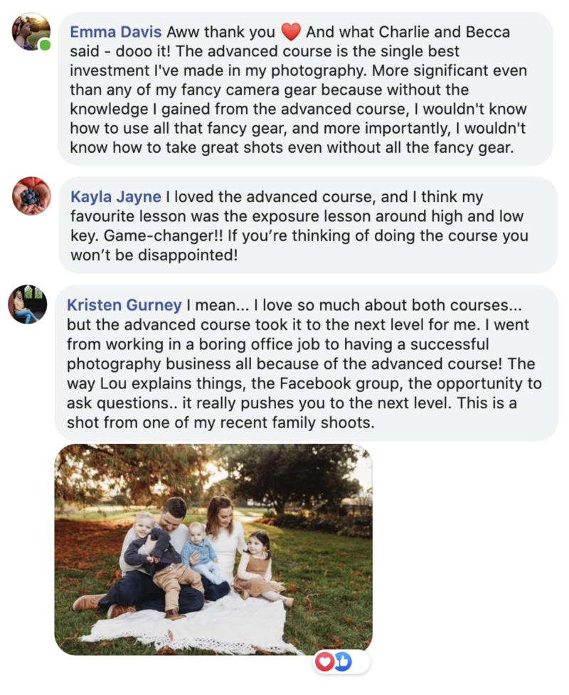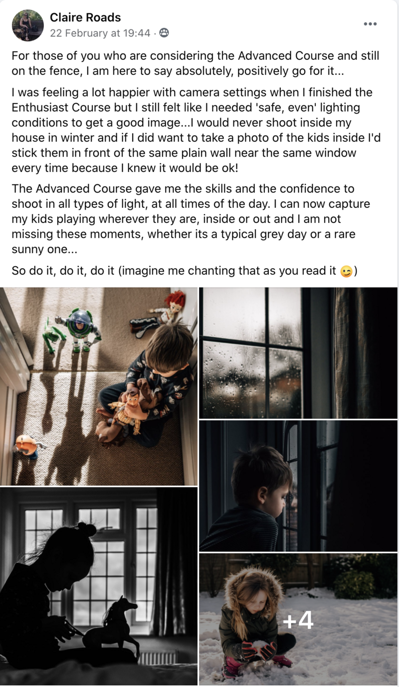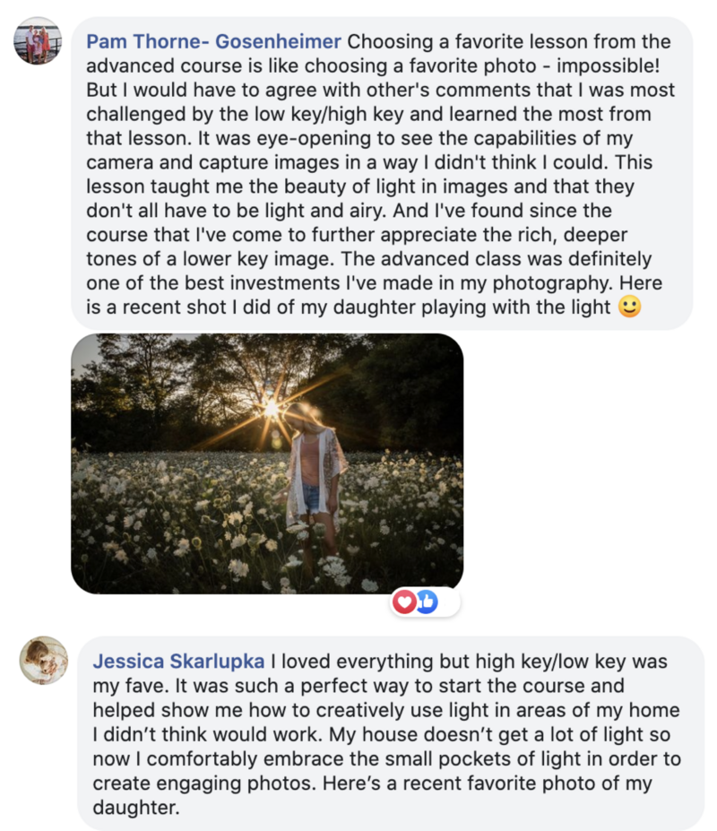 Yes! If you feel that our Enthusiast Course is perhaps a little too beginner for your skill set, then this course is for you! If you’re comfortable shooting in manual mode, but are ready to go to the next level in advancing your skills, and discovering just how to create gorgeous photos through skills such as understanding composition, lighting and post processing, then this course is for you, and we’re excited to welcome you into the Click Love Grow community!