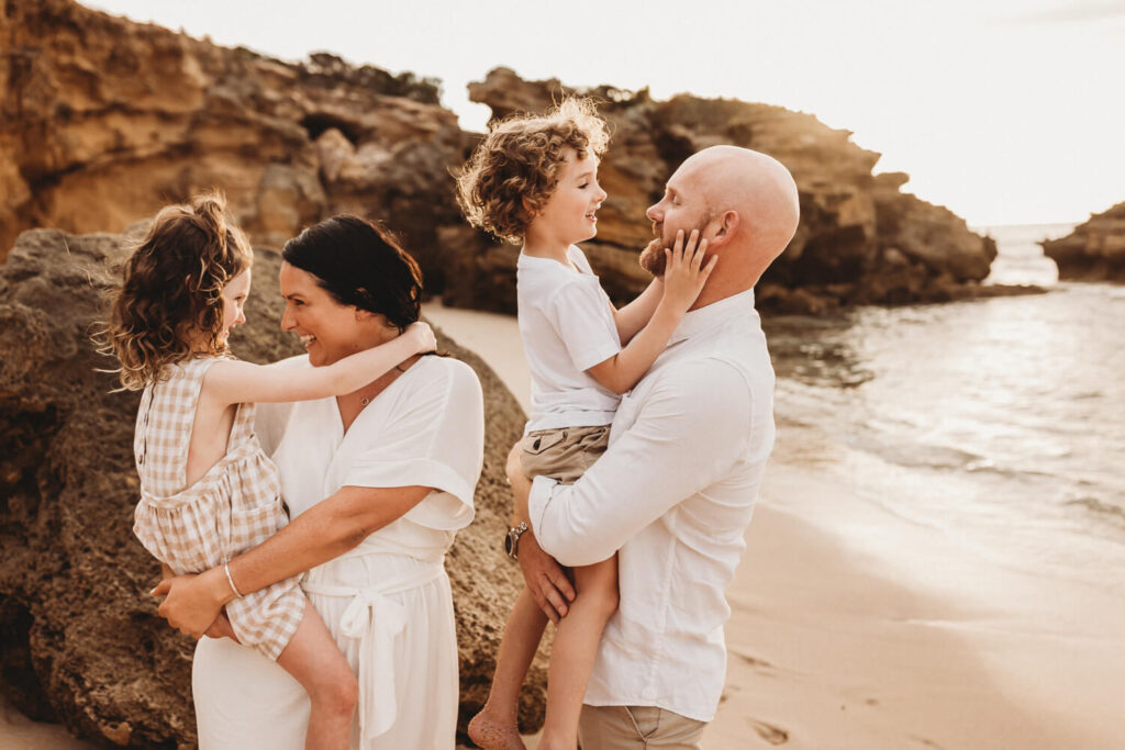 When shooting family portrait poses on a beach, open shade is rare. So, you’ll either be wanting an overcast day when the sun is filtered through clouds, or you’ll need to shoot during the golden hours of the day. That’s the 1-2 hours before sunset or after sunrise.